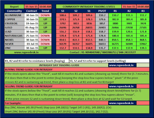 MCX INDIAN COMMODITY INTRADAY SUPPORT RESISTANCE LEVELS: 15.Jun.2015