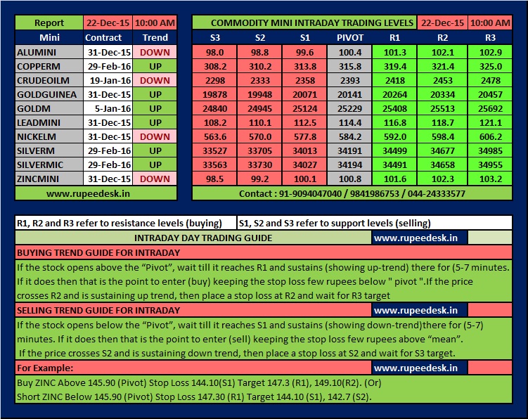 MCX COMMODITY MINI INTRADAY SUPPORT RESISTANCE LEVELS: 22.Dec.2015